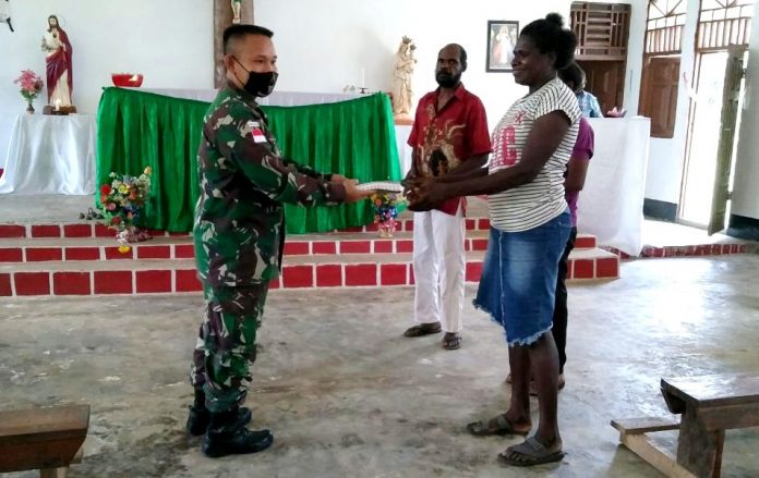 MERAUKE, PapuaSatu.com – Untuk menumbuhkan dan mendorong semangat warga jemaat agar lebih giat beribadah, Satgas Pamtas RI-PNG Yonif 125/Si’mbisa membagikan sejumlah Alkitab kepada jemaat Gereja Katolik St. Yohanes De De Deo, Kampung Yanggandur, Distrik Sota, Kabupaten Merauke, Minggu (11/10/2020).