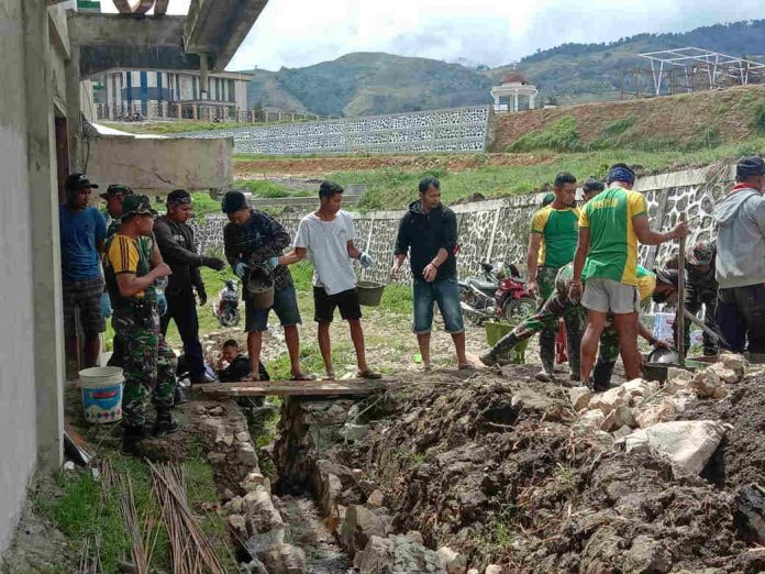 TIOM, PapuaSatu.com – Sejumlah anggota Babinsa Koramil 04 Tiom Kodim 1702/Jayawijaya, dipimpin langsung oleh Sertu Jumali dan 10 orang Babinsa lainya ikut bergotong royong bersama warga melaksanakan pengecoran Mushola Al Muhajirin bertempat di Kampung Kunggunagineri Distrik Tiom Kabupaten Lanny Jaya, Minggu (22/11/2020).