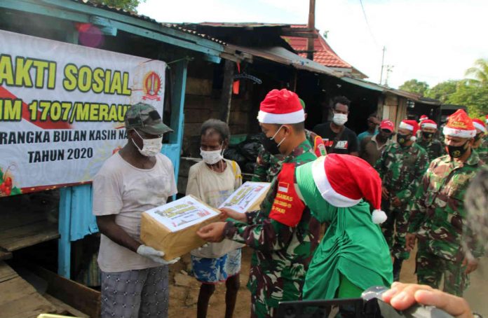 MERAUKE, PapuaSatu.com – Kodim 1707/Merauke yang dipimpin langsung Komandan Kodim 1707/Merauke Letkol Inf Eka Ganta Chandra, S.I.P. menggelar bakti sosial berupa pembagian paket sembako kepada Masyarakat dan Warakawuri yang ada di Kota Merauke, pada Rabu (23/12/20/20).