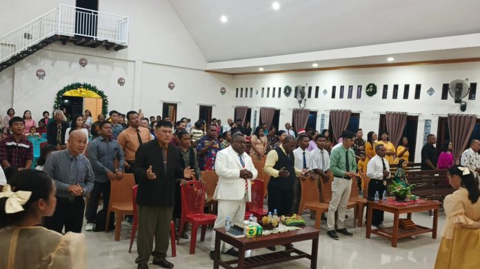 Suasana perayaan Natal diawali dengan penyembahan dan pujian yang diikuti seluruh jemaat dilanjutkan dengan penyalaan lilin oleh Ketua Majelis Daerah GPdI Provinsi Papua, Pdt. Timotius Dawir, bersama Gembala Jemaat Kana, Pdt. Semuel Gerungan, serta pengurus jemaat.